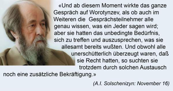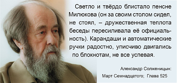 "Klar und fest leuchtete der Zwicker von Miljukow (er stand nicht, sondern saß an seinem Tische, - die freundschaftliche Wärme des Gesprächs verdrängte die Kühle des offiziellen Anlasses). Die Stifte und Kugelschreiber glitten freudig und schreibwütig über die Seiten der Notizblöcke, wobei sie vieles verpassten."