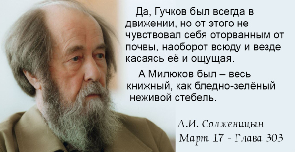 Gutchkow ist derjenige, der, zusammen mit Schulgin, während der als "Februarrevolution" bekannten Unruhen in Pskow die Abdankung des Zaren entgegennahm. Unter all denjenigen, welche durch diese Unruhen hochgeschwemmt wurden, gehören beide, Gutchkow und Schulgin, zu den stärkeren, eigenständigeren Persönlichkeiten. Gutchkows Autobiographie habe ich gelesen; wenn ich sie zur Hand hätte, würde ich sie nochmal lesen und bei der Gelegenheit auch einiges davon mit Kommentaren auf der Russisch-Seite veröffentlichen. Kommt vielleicht noch (von Schulgin habe ich bereits was veröffentlicht).